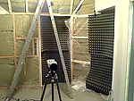 Auf dem Bild sieht man die leeren Lattengerüste für einen Eckenabsorber, sog. „Super Chunk“, und die seitlichen 10 cm dicken Breitbandabsorber.
