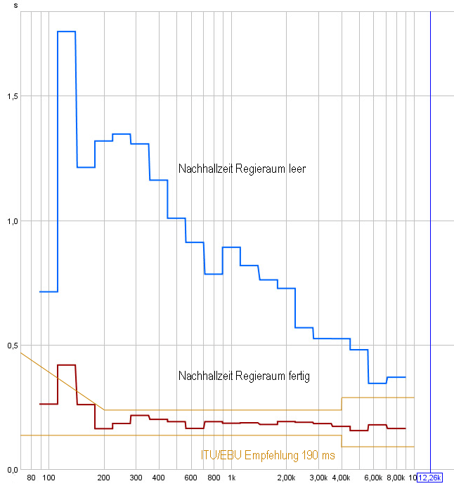 Bild 1: Nachhallzeit des Regieraums durch akustische Maßnahmen (bis auf 150 Hz sehr gleichmäßig bei ca. 0.19 s und innerhalb der Empfehlungen für diese Raumgröße)