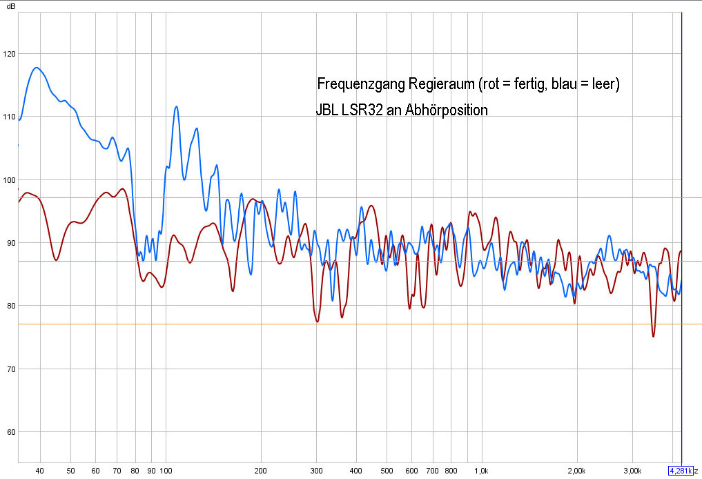 Bild 4: Frequenzgang der Abhöre im leeren Raum und im fertigen - durch akustische Maßnahmen wurde der Frequenzgang deutlich geglättet