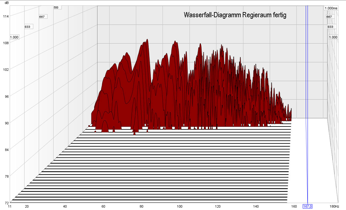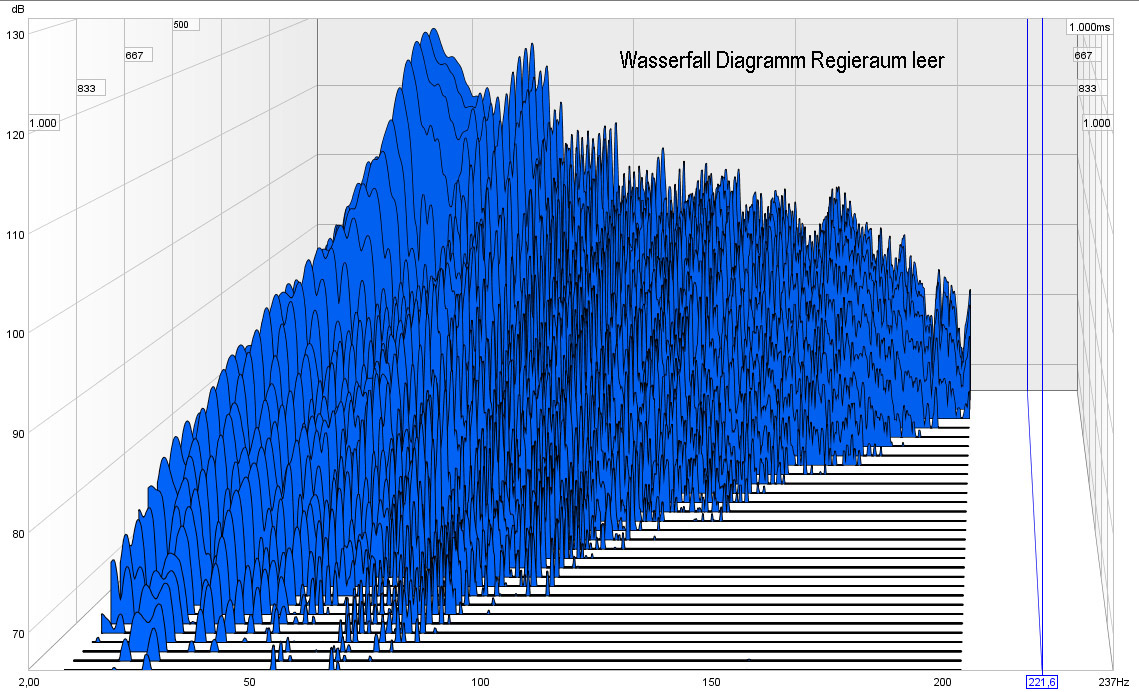 Bild 3: wasserfalldiagramm des fertigen Regieraums - man sieht im Vergleich mit Bild 2, wie vorallem der Nachhall im Bassbereich wirkungsvoll bedämpft wurde