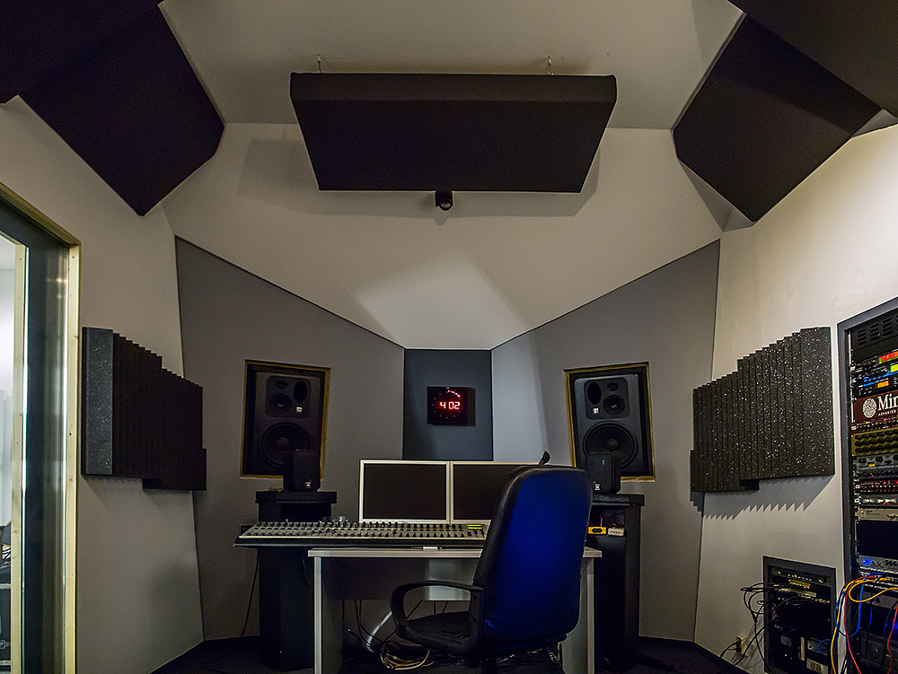 Die Akustik des Aufnahmeraums ist insbesondere für akustische Instrumente extrem wichtig. Um flexibel zu sein und einem weiten Anwendungsbereich der Rockmusik gerecht zu werden, haben wir uns für einen neutralen Raum mit einer Nachhallzeit von 0.5s entschieden. Der Raum ist damit noch lebendig genug für Schlagzeugaufnahmen, aber trocken genug für Gesang, Bass, Gitarren. Um Flatterechos zu vermeiden und Raumresonanzen zu verringern enthält der Raum keine parallelen Wände. Selbst die Decke ist angewinkelt. Die Nachhallzeit wurde mittels Breitband- und Bassabsorbern im gesamten Frequenzbereich auf ca. 0.5s gelegt. Der genaue Wert ist nicht so wichtig, wichtig die Konstanz über das gesamte Spektrum. Auf Noppenschaum und andere ungeeignete akustische Maßnahmen welche den Raum nur dumpf machen und Dröhnfrequenzen im unteren Mitten- und Bassbereich nicht dämmen, wurde komplett verzichtet. Überhaupt wurde kein Absorber einfach so auf Verdacht oder nach Gefühl angebracht. Vor dem Bau wurden umfangreiche Berechnungen angestellt und beim Bau der Absorber wurde immer wieder die Nachhallzeit gemessen, um den Erfolg der jeweiligen raumakustischen Maßnahme direkt zu kontrollieren und gegebenenfalls zu korrigieren. Die Akustik des Aufnahmeraums ist für seine Größe von rund 35 m² und für ein kleines Projektstudio Spitzenklasse. Da sich das Studio im Ort befindet ist die Schalldämmung nach außen so dimensioniert, dass der herauskommende Lärm weniger als 45dB(A) ist. Damit ist auch Schlagzeugaufnahme zu nächtlicher Zeit möglich.