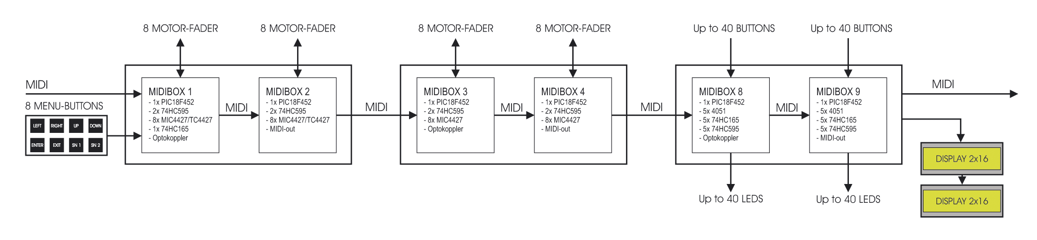 Die ersten beiden Module mit je einem PIC18f452 kümmern sich um je 8 Motorfader. Am ersten Modul sind zusätzlich noch die Menu-Buttons angeschlossen. Da die Kommunikation von Modul zu Modul unidirectional per MIDI erfolgt musste das so sein, weil ein hinteres Modul keine Nachrichten zu einem weiter vorn in der Kette senden kann.