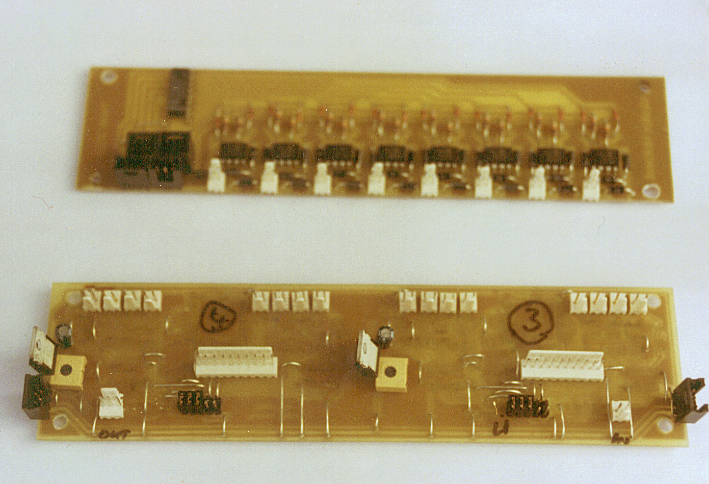 Motorfader-Modul 3/4 Oberseite und Unterseite, zum Vergleich jeweils eine alte Motorfaderansteuerung