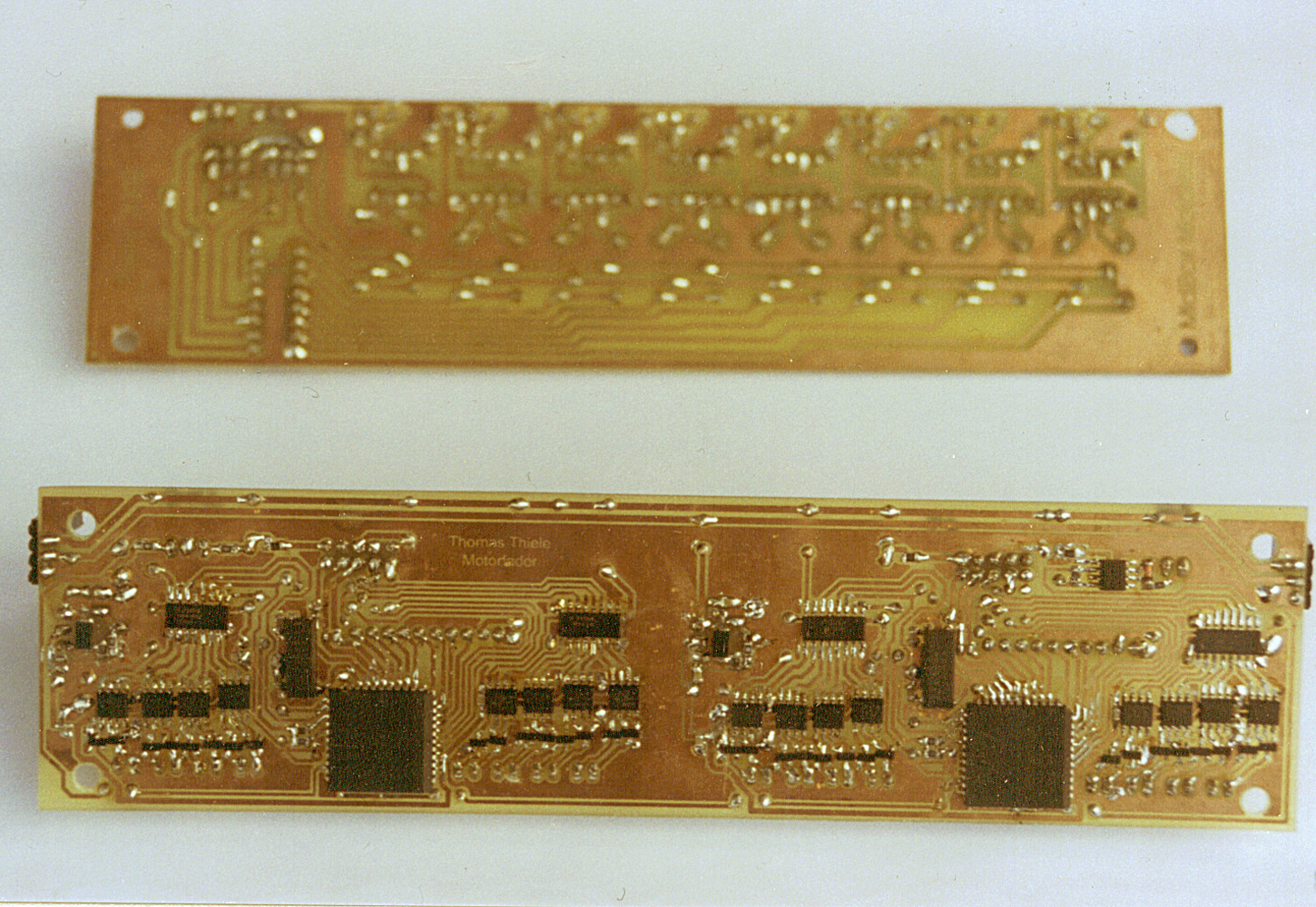 Die Layouts für die Motorfadermodule wurden mit Eagle Free (Größe 100mm x 50mm) erstellt und dann im Graphikprogramm zur entgültigen Größe von 200mm x 50mm zusammengebaut. Damit entsprechen jeweil zwei neue Motorfadermodule zusammen auf einer Platine genau der Größe eines alten Motorfadermoduls.